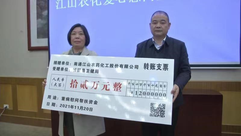 11月19-21日,江山股份參與南通開發(fā)區(qū)管委會組織的蘇陜協(xié)助考察交流活動,在城固縣-南通開發(fā)區(qū)對口協(xié)助交流座談會暨第十五次聯(lián)席會上,江山股份代表與城固縣衛(wèi)健局簽訂《城固縣重病戶慰問幫扶協(xié)議》,并捐贈十二萬元用于幫扶城固縣40戶重病戶困難家庭。